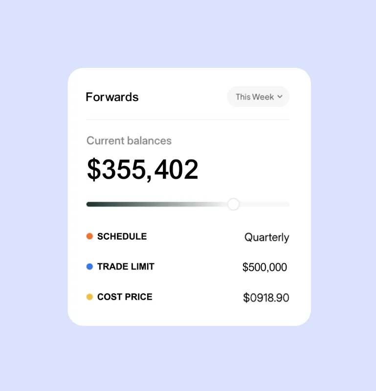 We use tailor-made FX solutions to protect your profits. For example, with a Forward Contract, we can lock in an exchange rate for you for a future date. This means you can guarantee your margin and stay on budget, even if the currency market moves against you.